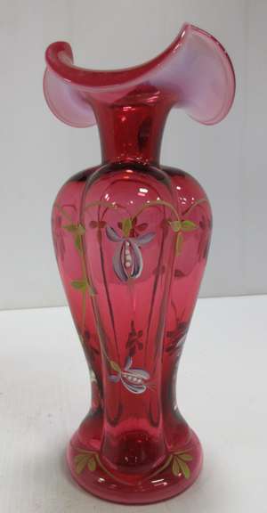 Fenton Cranberry Vase with Hand Painted and Logo Sign on Bottom