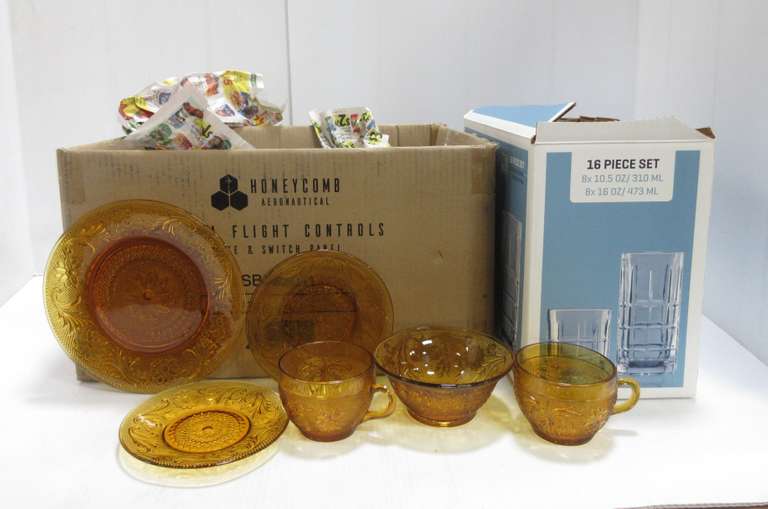 (2) Boxes of Tiera Dishes, Including: Three-Piece Canister Set, 2- Serving Bowls, Cookie Platter, Veggie Tray, Napkin Holder, Clock, 2- Sconces, Butter Dish, and 6- Glasses