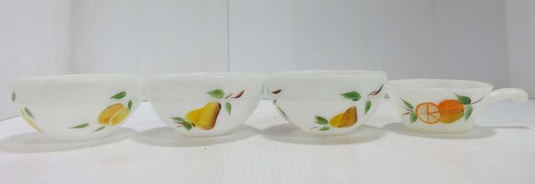 (4) Fire King Gay Fad Bowls, Painted Fruit Design, Anchor Hocking and Pyrex: 3- Bowls, 6"Dia x 3"H; 1- with Handle, 5"Dia x 2 1/2"H