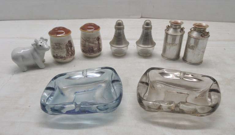 Creamer with Matching Salt and Pepper Shakers, (2) Additional Salt and Pepper Shaker Sets, Cow Salt and Pepper Shaker, and (2) Glass Ashtrays