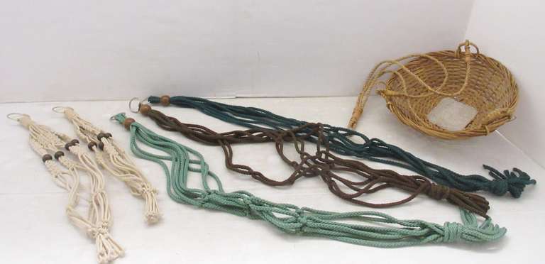 Indoor Plant Hangers: (3) Macrame, 40"L; (2) Macrame, 19"L; Wicker Basket, 12"W x 32"L