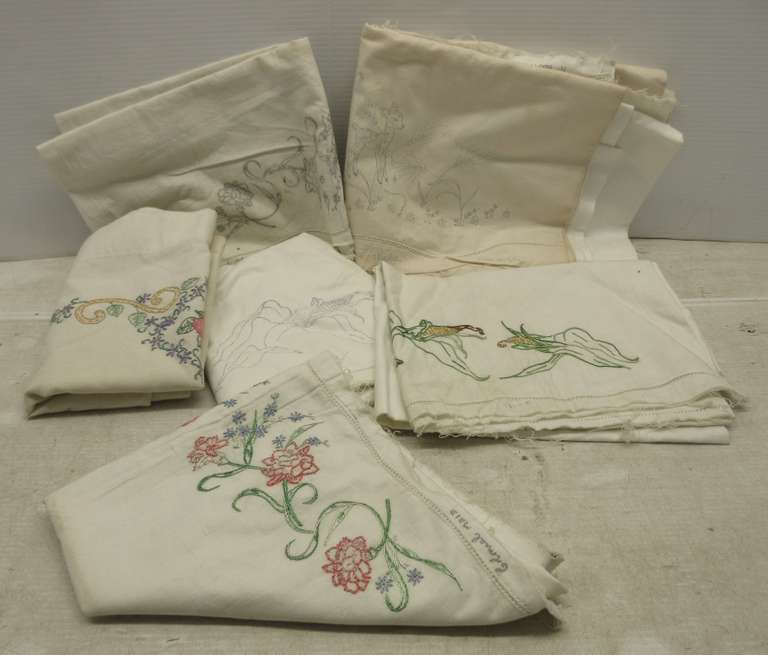 (8) Embroidered pillow cases, some are already finished, others are stamped and waiting to be finished, show some staining from age, good to fair