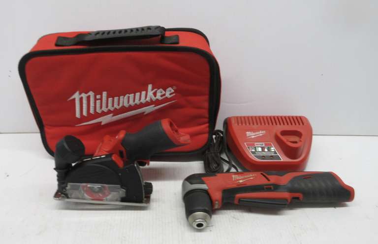 Milwaukee M12 3" cut-off tool, works; Milwaukee M12 right angle drill with charger and bag, works