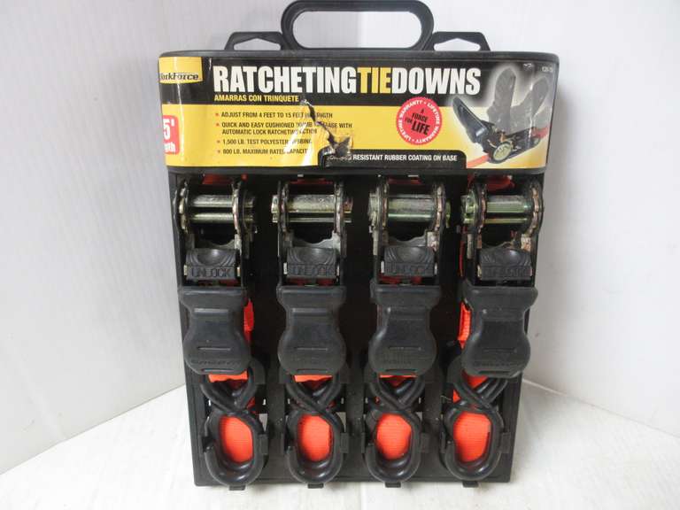Set of (4) Workforce 15’L ratcheting tie down straps, 800 lbs. Max capacity, never used