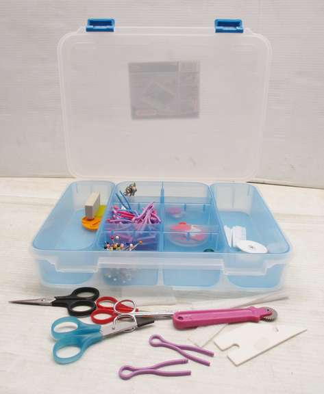 Divided case full of sewing accessories scissors, wax, bobbin clips, needles straight pins, needle threaders, and more, 10 ¾”W x 13 ⅜”L x 2 ½”H