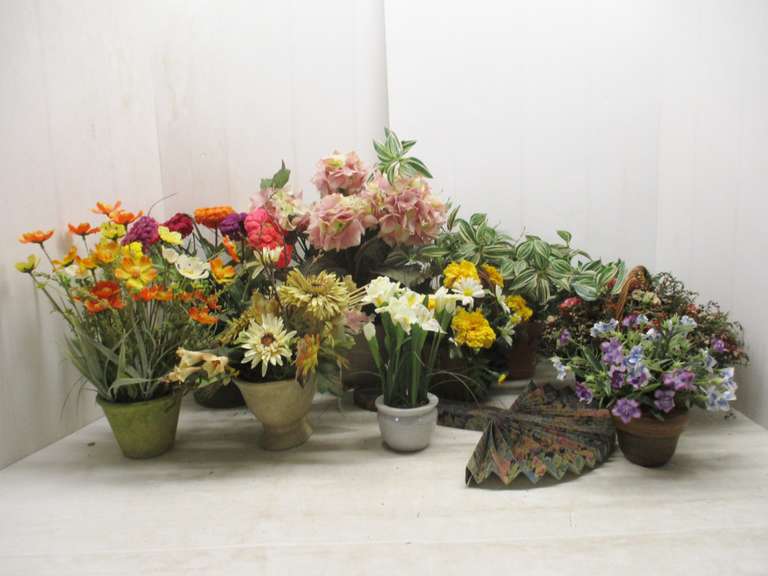(4) Violet snack plates with 3 cups, (6) Violet small plates, (2) Floral pictures, Morning glory bowl, Plastic garden trivet, Violet hand painted basket, Vase, Metal pansy tray, and Chalkboard sign