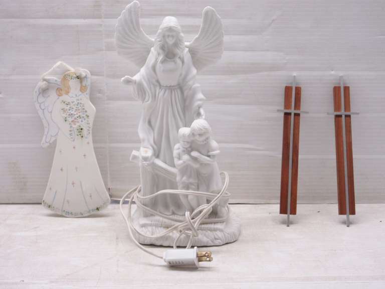 Guardian angel night light and angel wall hanging signed by Moffett, works, (2) Hanging crosses, nice condition