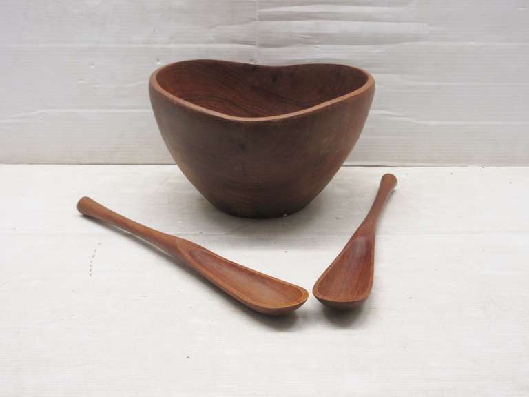 1950's Danish salad bowl with spoons, Remnants of original maker sticker on bottom