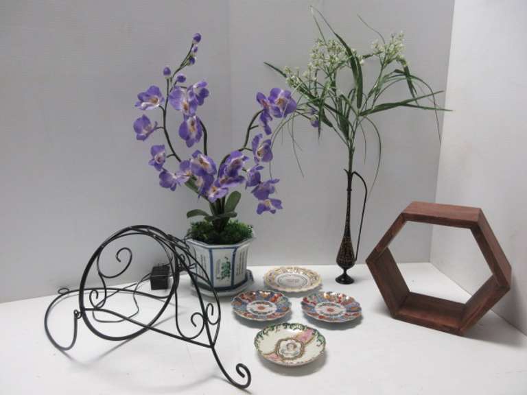 Blue Fiber Optic Orchid Light in a Glass Chinese Designed Octagon Bowl with a Matching Dish; 26" Vase, Blackened Brass, Fine Cuts Throughout; (4) Signed Saucers, 14"Dia, Signed in Chinese