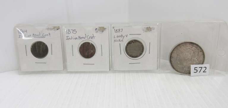 1921 Morgan Silver Dollar, 1887 Liberty V Nickel, 1864 Indian Head Cent, and 1875 Indian Head Cent