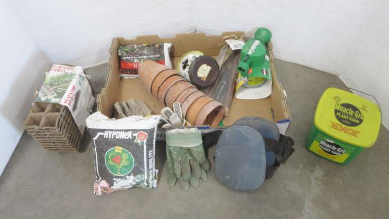 Gardeners Supplies, Include: (50) Starter Pots, Plant Markers, Miracle Grow, (2) Feeder Packs and Miracle Grow Feeder Attachments, Perlite, Knee Guards, Clay Pots, Garden Gloves, and a Birdhouse