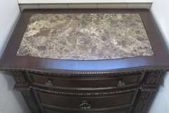 Large Dark Wood Hillcrest Manor by Woodhaven Hill Three-Drawer Bedroom Nightstand/End Table with Top Inlaid Marble and Very Ornate Wood Carvings, Matches Lot Nos. 12, 13 and 14